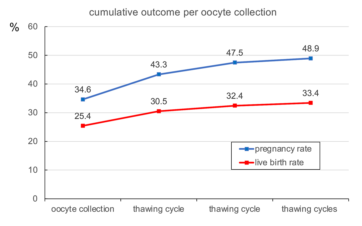 Figure 2 Cumulative pregnancy and live-birth rate during the cycle with oocyte collection and in subsequent thawing cycles of cryopreserved embryos. Due to low numbers cycle 4 and 5 are summarised as “thawing cycles”. Only one embryo in the blastocyst stage was transferred in all treatment cycles.