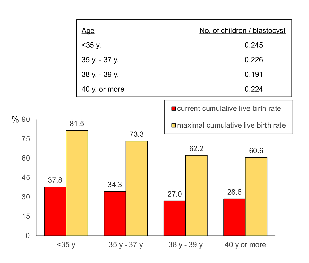Figure 4 The number of children per transferred blastocyst was calculated for different age groups and was multiplied by the total number of blastocysts per infertile couple still remaining cryopreserved (inset table). The cumulative live birth rate per oocyte collection achieved during the observation period is compared with the maximum cumulative live birth rate calculated from the total number of blastocysts originating from the oocyte collections performed in 2018 and 2019.