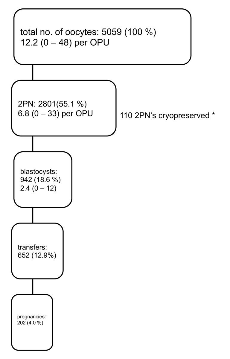 Figure 1 The stepwise fate of 5059 oocytes obtained during 413 oocyte retrievals (OPUs) in 381 infertile couples is presented graphically. IVF or ICSI led to 2801 oocytes displaying two pronuclei (2PN, 55.1% per harvested oocyte), to 942 embryos in the blastocyst stage (55.1% per oocyte), to 652 transfers of single embryos (12.9% per oocyte) and to 202 pregnancies (4.0% per oocyte). * As Swiss legislation does not allow the cryostorage of more than 12 embryos, we cryopreserved 110 oocytes in the pronucleate stage.