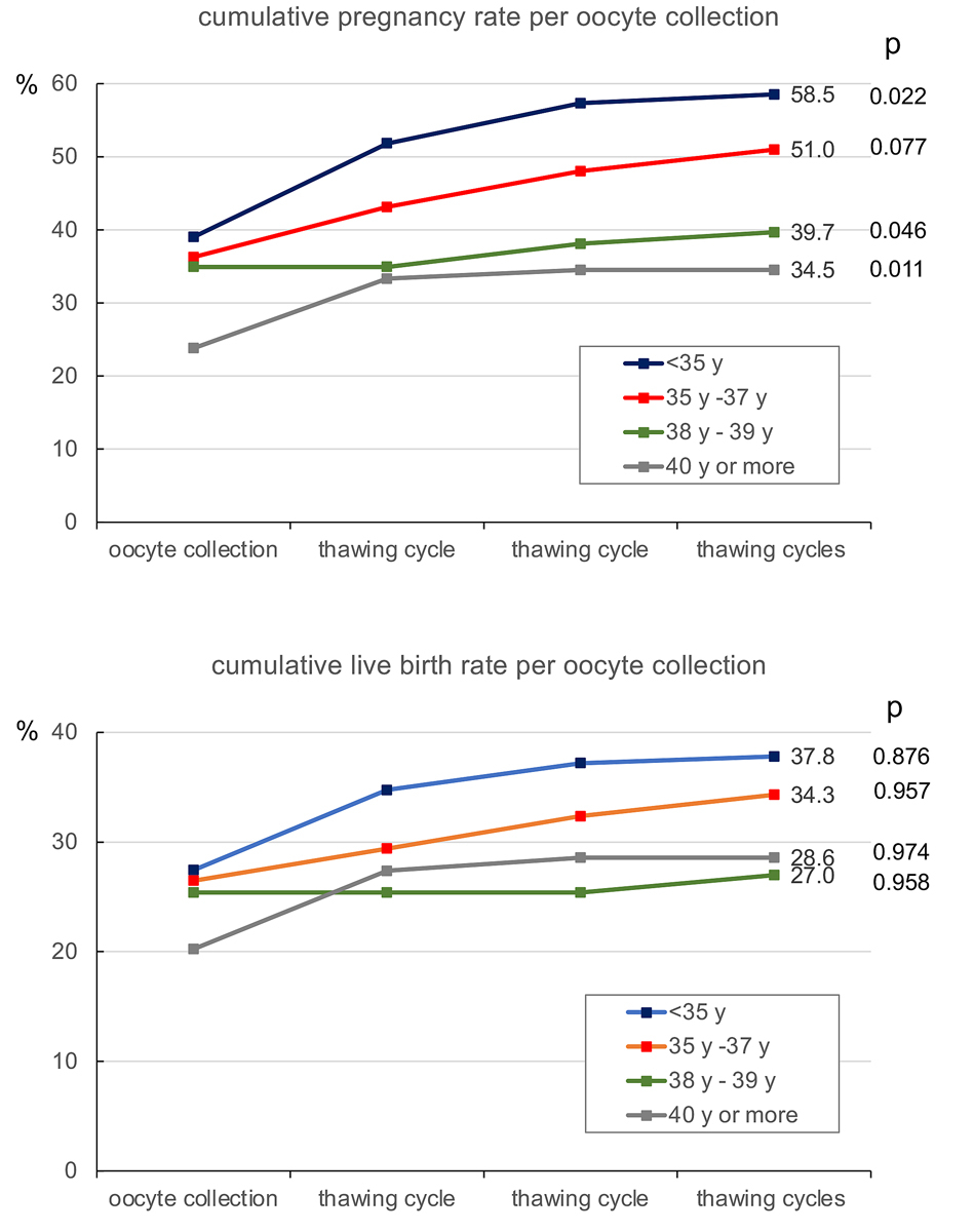 Figure 3 The cumulative pregnancy and live-birth rates are depicted according to various age groups at the moment of oocyte collection. Due to low numbers cycle 4 and 5 are summarised as “thawing cycles”. Only one embryo in the blastocyst stage was transferred in all treatment cycles.