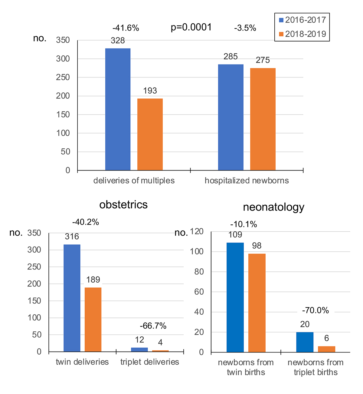 Figure 5 The impact of the embryo transfer policy in our institution before and after the decision to transfer only one embryo in all ART treatments on the number of multiple deliveries in the department of obstetrics of the Women’s Hospital of the University and in the department of neonatology of the Children’s Hospital of the University. A decline in both twin and triplet deliveries, and twin and triplet newborns, is observed between the time periods 2016–2017 and 2018–2019.
