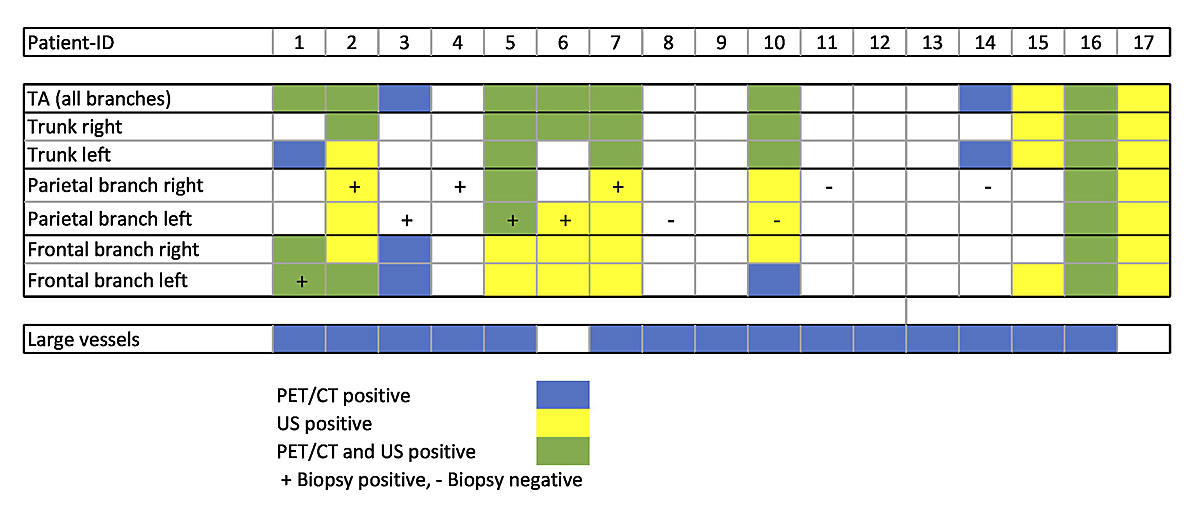 Ultrasound seemed to be more sensitive than PET/CT in detecting vasculitis in the parietal branch. This is not due to a difference in vessel size, as the frontal and parietal branches did not differ in diameter. However, branches with a diameter <1.4 mm were not detected by PET/CT in our patients in general, which might be a technical limitation on the use of PET/CT, given the high variability of temporal artery size. The low sensitivity of PET/CT within the parietal branch might be explained by the more vertical course of this vessel compared with the frontal branch, which could impede the detection of pathological findings in the axial PET/CT images.