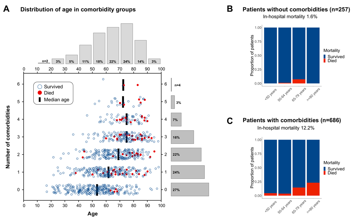 Figure 4 Mortality stratified by patients with and without comorbidities. Panel A shows a scatter plot with the circle representing all patients stratified by age and number of comorbidities. Blue circles represent survivors and red circles represent patients who died during the hospitalisation. Panels B and C report the proportion of in-hospital mortality in patients without any (B) and with any (C) comorbidities stratified by age.