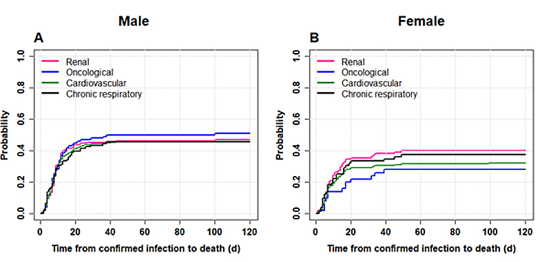 Figure S1 Cumulative incidence of death for patients aged 80+ (panel A male, panel B female) and according to the following comorbidities: renal disease, oncological pathologies, cardiovascular disease and chronic respiratory disease. Data includes patients hospitalised up to 1 September 2020 (data extracted from the CH-Sur database on 15 January 2021). Time to event is defined as the time elapsed from confirmed COVID-19 infection to death.