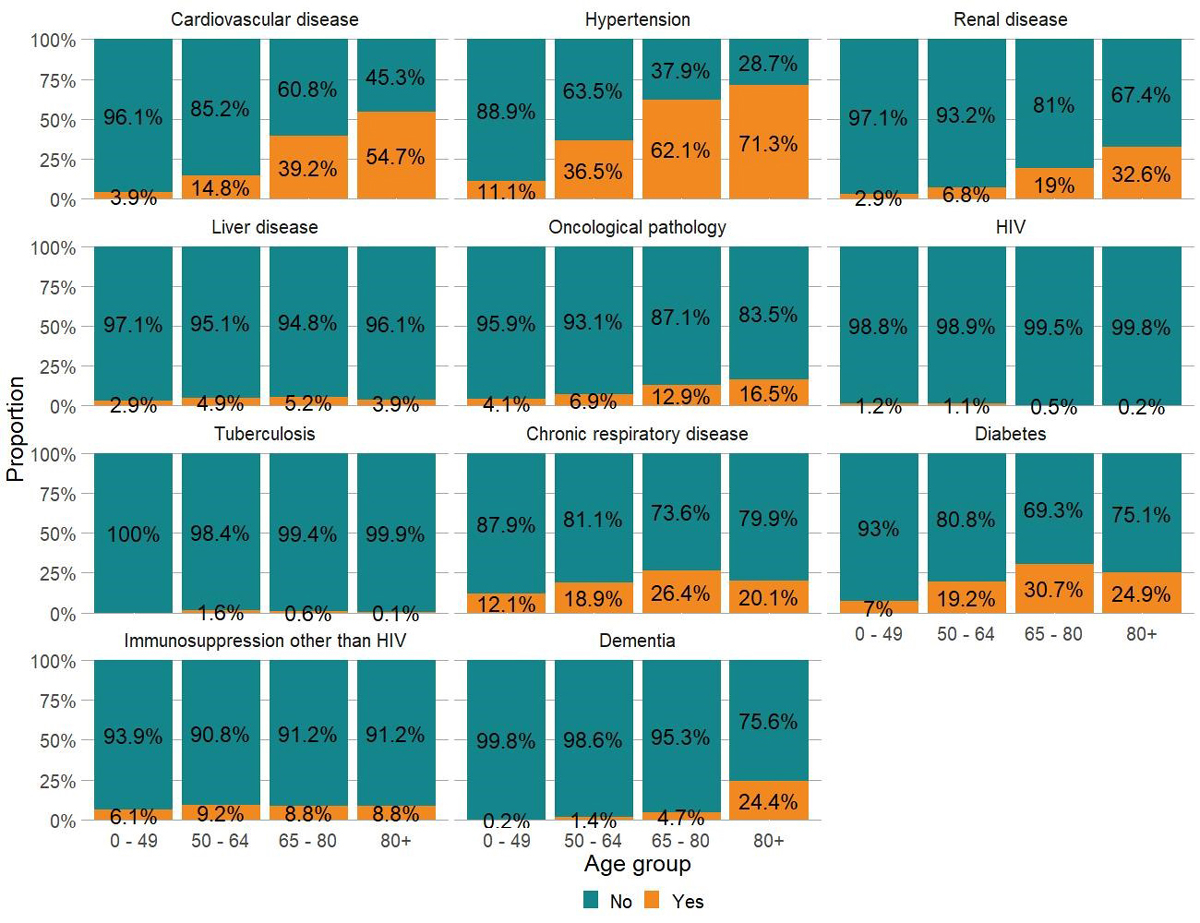 Figure 2 Proportions of patients with and without comorbidities in four age classes for 3590 adult patients hospitalised for COVID-19 in Switzerland. Data included up to 1 September 2020 (date of extraction 15 January 2021). Missing values have been excluded. Obesity and smoking are not presented in this figure, owing to a high proportion of missing values, 25% and 43%, respectively.