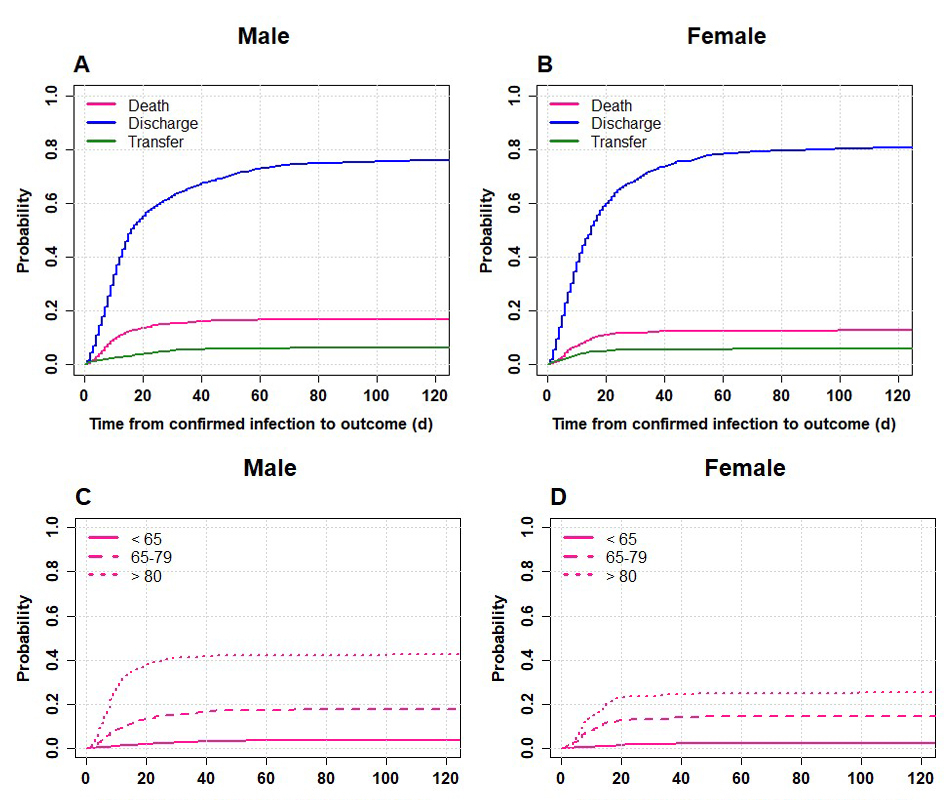 Figure 3 Cumulative distribution functions by gender for 3550 adult patients hospitalised for COVID-19 in Switzerland. Left panels A,C: male patients, right panels B,D: female patients. Panels A,B: all three outcomes – death, discharge and transfer – Panels C,D: outcome death in three age classes. Data included up to 1 September 2020 (date of extraction 15 January 2021). Time to event is defined as the time elapsed from confirmed COVID-19 infection to the event of interest (death, discharge, transfer).