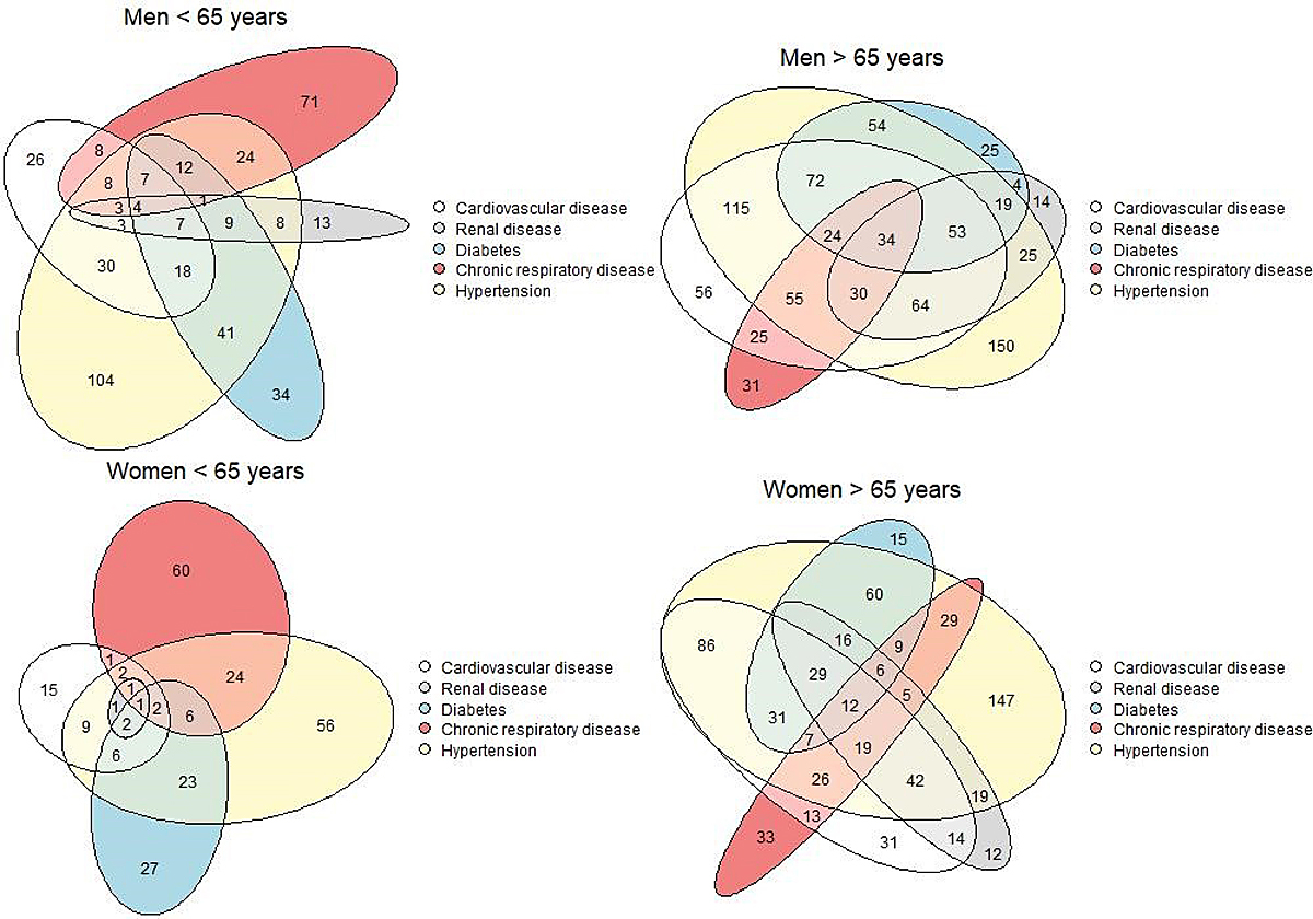 Figure 1 Scaled Euler diagrams by age and gender showing the overlap of the five most common comorbidities for 3590 adult patients hospitalised for COVID-19 in Switzerland. Data included up to 1 September 2020 (date of extraction 15 January 2021). Missing values have been excluded.