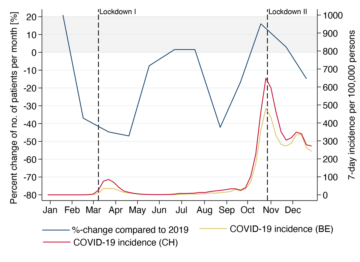 The reduction in major trauma cases correlates with the regulations issued by the authorities [4]. February to April 2020 corresponds to the timeframe of the first peak in incidence of the pandemic in Switzerland, when restrictions were implemented. In August 2020, the second rise in incidence began, but in the peak in November 2020 the number of patients admitted was similar to 2019 and the effect seen during the first peak in incidence was less marked. This might have been the effect of campaigns to encourage patients to seek safe treatment in hospitals and EDs in countries that observed a decline in ED consultations during the first peak in incidence [19], although severely injured patients were presumably less influenced than critically ill patients.