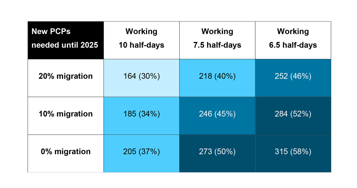 To offset this drop of 0.19 PCPs in FTEs per 1000 inhabitants, we calculated the need for new PCPs by 2025 depending on different scenarios. Figure 2 shows how many new PCPs are needed by 2025 to retain the workforce in 2020 and what percentage of medical students would be needed to become PCPs to achieve this number. Each scenario accounts for the number of half-days new PCPs will choose to work (10, 7.5 or 6.5 half-days) and how much support from abroad will be available (migration of 0%, 10% or 20%). The caption to figure 2 provides further explanation.
