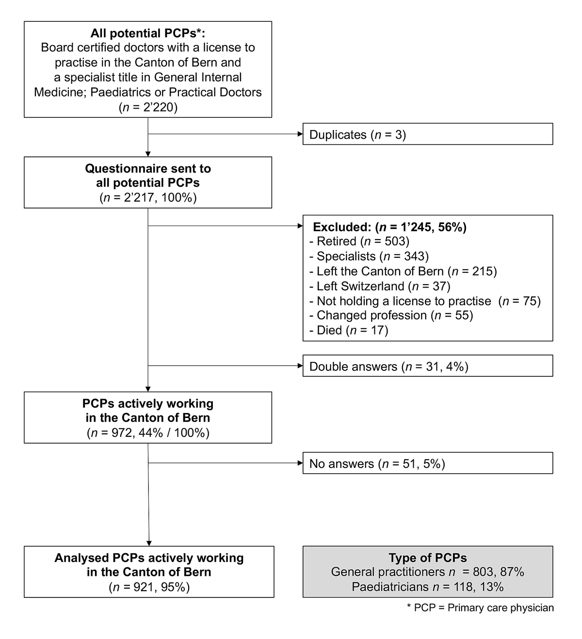 Out of 2217 potential PCPs in MedReg, we eventually excluded 1245 (56%) in accordance with our exclusion criteria, primarily because of retirement, specialisation and change of canton (fig. 1). We identified 972 active PCPs. All but 51 (5%) PCPs participated by returning the paper-based or online questionnaire, or by phone.