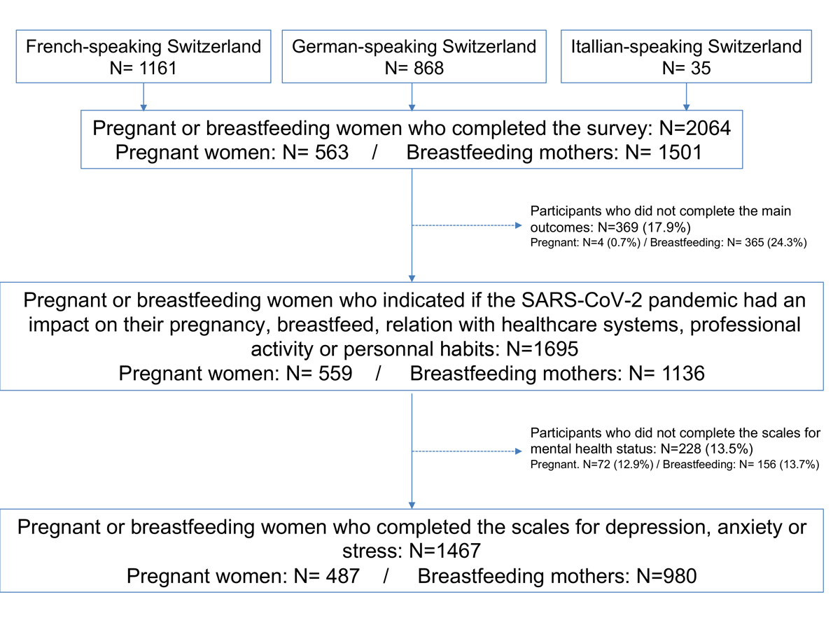 A total of 2064 respondents participated in the survey (1161 using the French, 868 the German and 35 the Italian questionnaires), including 1501 breastfeeding and 563 pregnant women. A total of 369 (17.9%) women did not complete the questions on the impact of the pandemic on pregnancy or breastfeeding experience. Therefore, 1695 (82.1%) contributed to the analyses addressing the primary aim of the study (1136 breastfeeding mothers and 559 pregnant women). Of these, 1467 (86.5%) patients completed the scales for depression, anxiety or stress, including 980 breastfeeding women and 487 pregnant women (fig. 1).