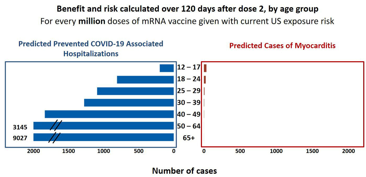 Figure 2 Potential risk of myocarditis with COVID-19 mRNA vaccination in the 120 days after vaccination and predicted prevention of COVID-19 hospitalisations. Adapted from Bozkurt B. et al. Circulation 2021 [7].