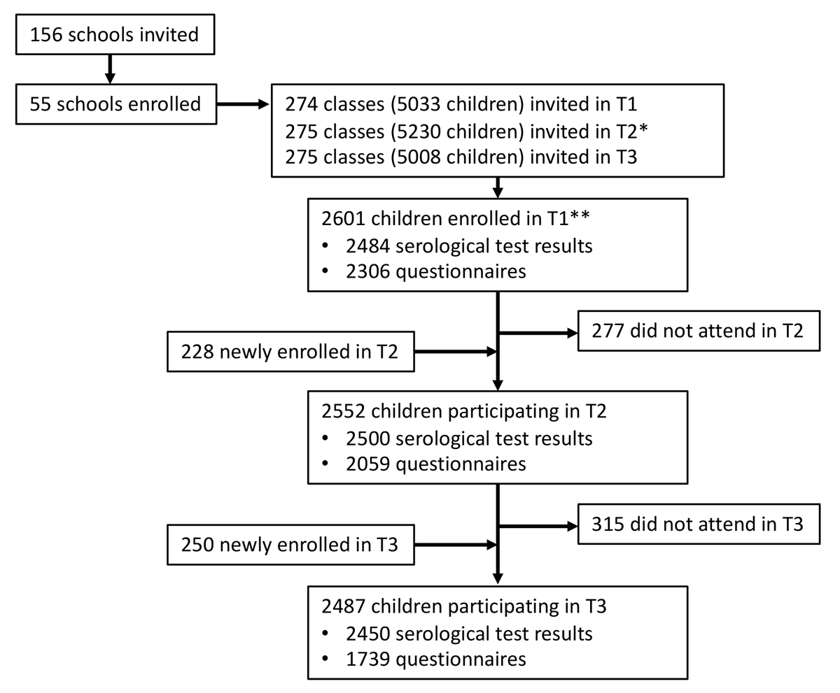 Parents of participants filled in online questionnaires on sociodemographic and health information on the child and household. In March-April 2021, parents of eligible non-participating children were invited to complete an anonymous questionnaire on the reasons for non-participation (details in appendix 3). After T3 testing, we interviewed the principals of schools in which at least two classes with new clusters of seropositive children were detected (details in appendix 4).