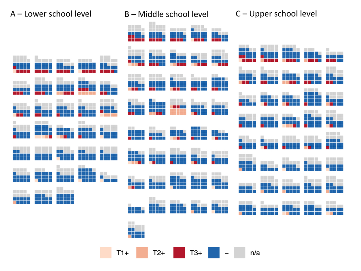 T1+ (light pink) – children who tested seropositive at T1 (June-July 2020), T2+ (middle orange) – children who tested seropositive at T2 (October-November 2020) but not T1, T3+ (dark red) – children who tested seropositive at T3 (March-April 2021) but not at T1 or T2, - (dark blue) – children who tested seronegative at T3 and were not test seropositive previously, n/a (grey) – children without a serological result at T3.