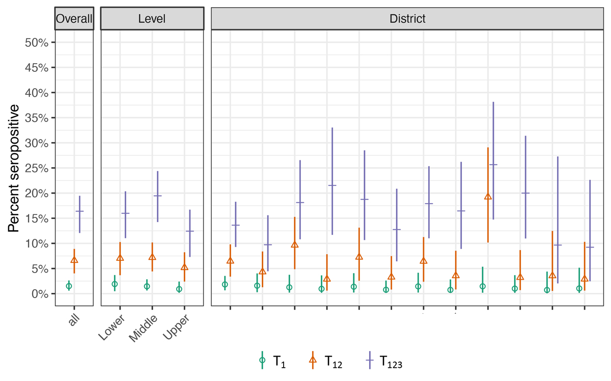 T1 – proportion of children testing seropositive by June-July 2020, T12 – by October-November 2020, T123 – by March-April 2021.