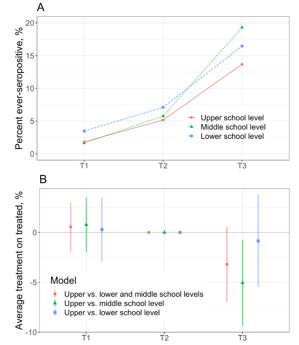 In the difference-in-differences analysis, the parallel trends assumption between T1 and T2 was valid based on visual inspection (fig. 3A) and formal examination with the linear probability models (fig. 3B). The proportion of ever-seropositive children in the upper school level was lower than expected at T3 in comparison with lower and middle school levels (absolute difference of 3.2%, 95% confidence interval [CI] –7.0% to 0.6%; p = 0.098, relative difference of 19%). The proportion was lower by 5.1% (95% CI –9.4% to –0.7%, p = 0.022, relative difference of 27%) when compared only to the middle school level, and by 0.8% (95% CI –5.4% to 3.8%, p = 0.718, relative difference of 6%) when compared only to the lower school level.