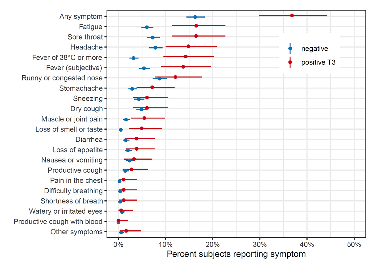 Figure 4 Symptoms reported between October-November 2020 and March-April 2021 in children who were seronegative and newly seropositive at T3 (March-April 2021).