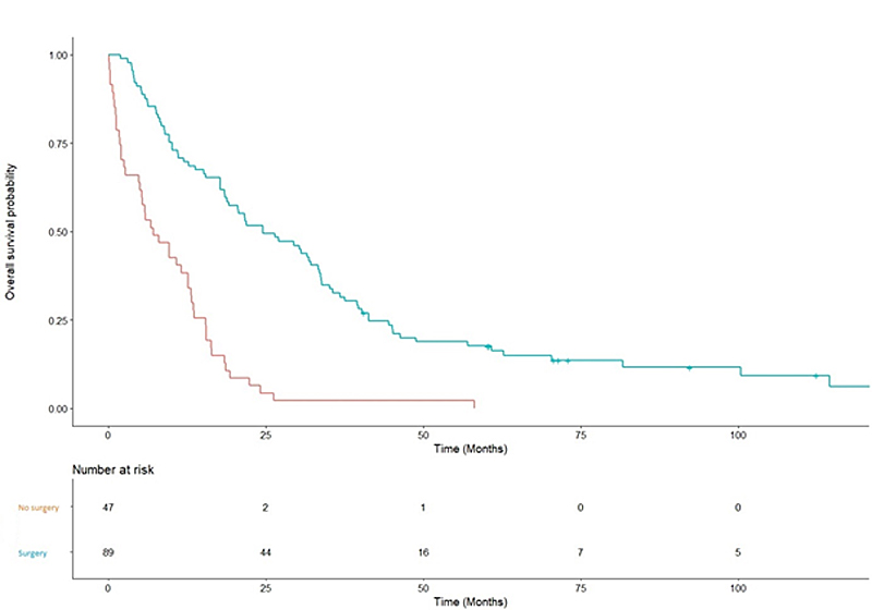 Median overall survival was 24.6 months for patients havingsurgery versus 7.1 months for patients who did not (p <0.001, fig. 1). Tumour-free status did not significantly impact the overall survival (19.7 vs 18.4 months ; p = 0.72).
