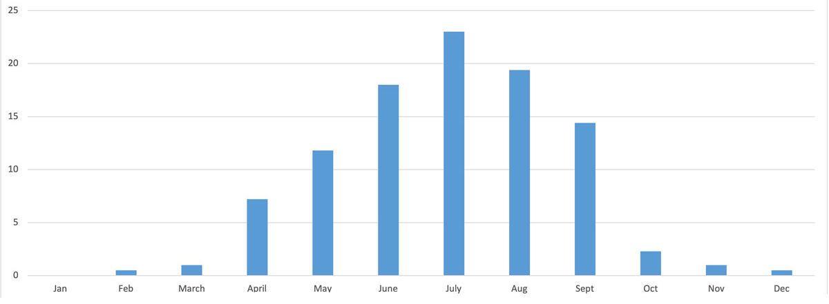 Figure 4 shows the seasonal distribution of bite events, with the highest incidence predictably in the summer months, with peaks in the hot months of June (40, 18%), July (51, 23%) and August (43, 19%).