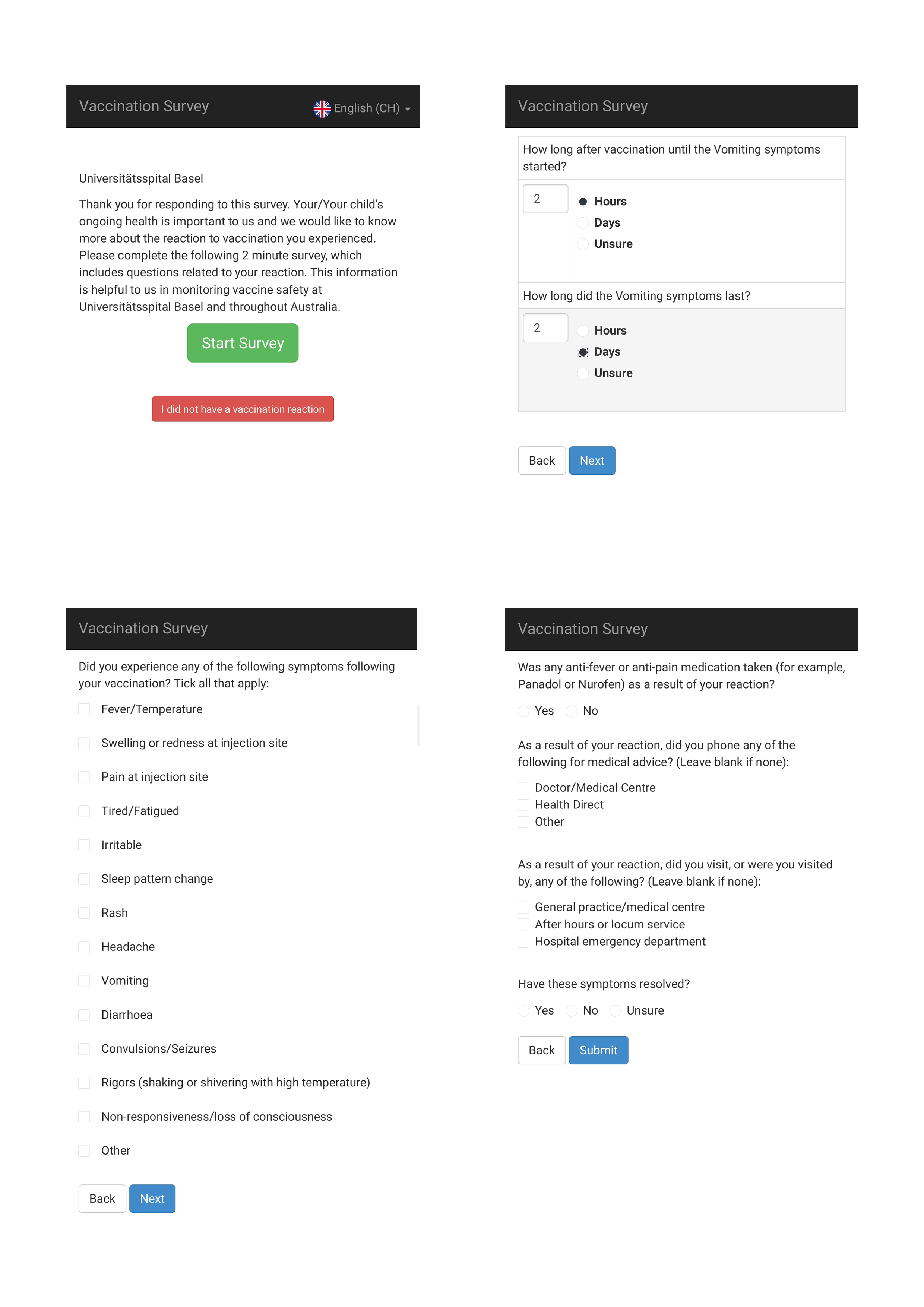 In collaboration with the developers of SmartVax in Australia (AL and IJP), we adapted the SmartVax software for use in Switzerland. Specifically, we translated the short message (SMS) text and user interface into German and set up a legal framework with the SMS provider. The SmartVax approach has been published previously [31]. Briefly, a short message (SMS-1) was sent to the participants 3 days after vaccination to ask whether they experienced any adverse event following the immunisation. The SMS-1 requests a “yes” or “no” reply by SMS. In the case of a “yes” reply to SMS-1, two additional SMS were sent: SMS-2 asking whether the reported adverse event was medically attended and SMS-3 providing a link to an online survey to be completed on the smartphone. The questions/data collected in the online survey followed the recommendations of the Brighton Collaboration on the analysis and presentation of vaccine safety data in pre- and post-licensure clinical studies [33, 34]. The online survey asked whether the subject experienced any of the following symptoms: fever/temperature, swelling or redness at the injection site, pain at the injection site, tiredness/fatigue, irritability, sleep pattern change, rash, headache, vomiting, diarrhoea, convulsions/seizures, rigours (shaking or shivering with high temperature), non-responsiveness/loss of consciousness or other, non-listed symptoms. In the case of "other", the symptoms could be typed in as free text. Participants could indicate the time to occurrence and duration for each reported symptom. Furthermore, they were asked (i) if they took any anti-inflammatory or pain medication to treat the reaction, (ii) if they contacted or visited a doctor, and (iii) if the symptoms had resolved ("yes", "no" or "unsure") (supplementary fig. S1 in the appendix). A study doctor (DSG) contacted by telephone all participants who indicated the symptoms had not resolved or were unsure about it.