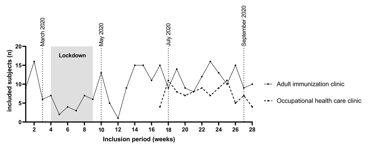 Figure S3 Number of subjects included per week in relation to the lockdown due to the COVID-19 pandemic. Lockdown: due to the COVID-19 pandemic from 16 March until 27 April 2020 all non-emergency medical services were deferred in Switzerland. The few visits at the adult immunisation clinic were subjects with immune-mediated inflammatory diseases needing immunisation before immunosuppressive therapy. Dotted lines indicate months for better orientation.