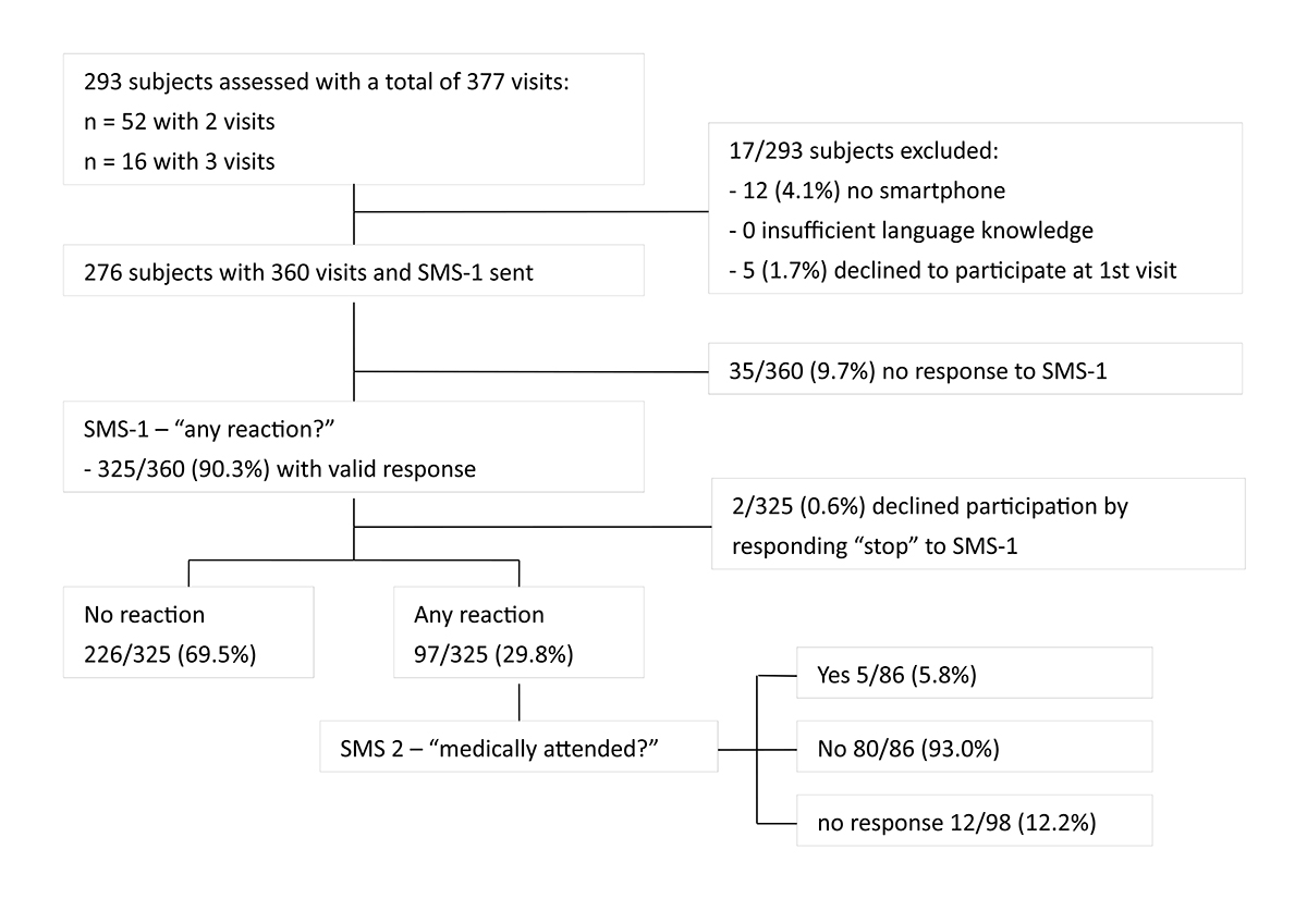 SMS: short message service; SMS-1: first SMS asking whether a reaction occurred following vaccination; SMS-2: second SMS asking whether the reaction resulted in a consultation with a physician.