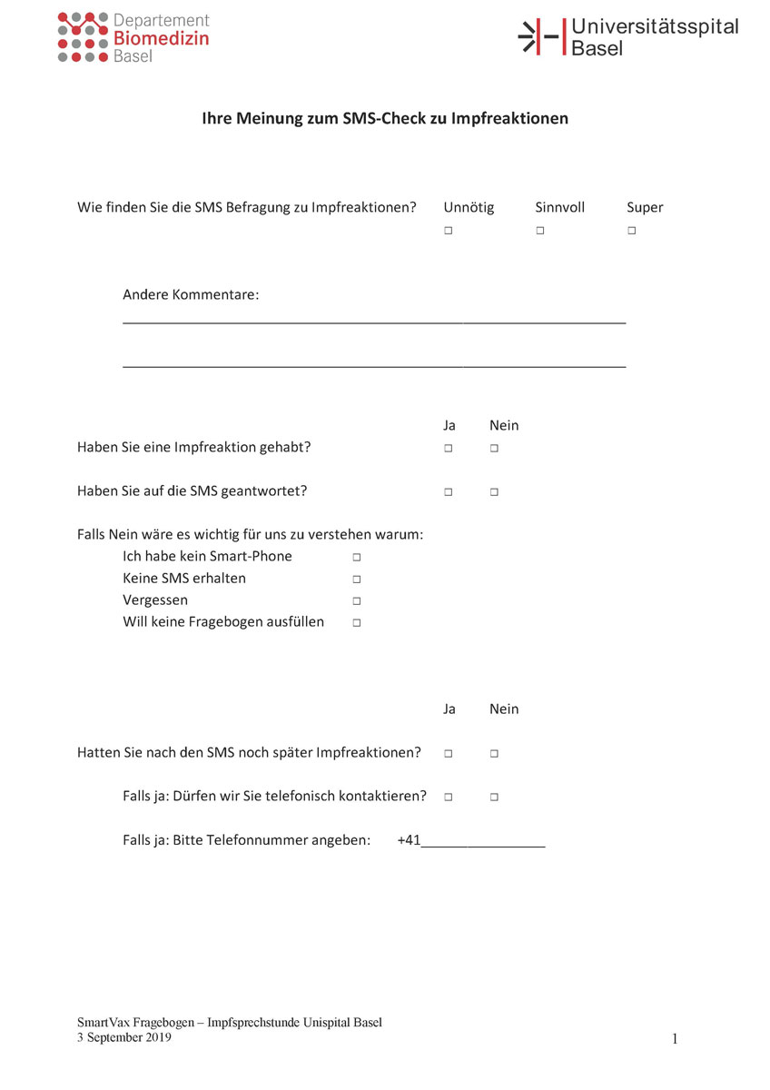 We report on findings from a single-centre pilot study defining the feasibility and acceptance of SMS-based active vaccine safety surveillance using SmartVax in an adult immunization clinic and employee health service at the University Hospital Basel, Switzerland.