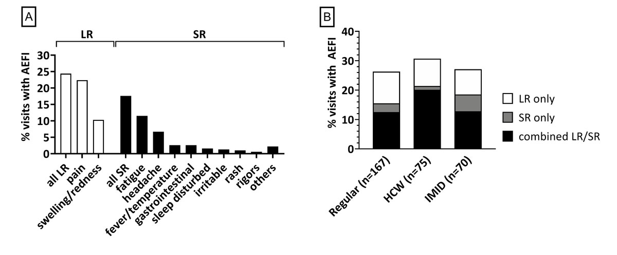 (A) The overall frequency of reported AEFI is displayed by reaction type. LR: local reaction; SR: systemic reaction; AEFI: adverse events following immunisation. (B) The frequency of immunisation visits associated with AEFI in the three clinical groups is displayed. Regular: routine vaccination check-up visits; HCW: healthcare workers; IMID: subjects with diagnosed immune-mediated inflammatory disease; LR only: reporting a local reaction only; SR only: reporting a systemic reaction only: combined LR/SR: subjects reporting at least one local and systemic symptom following the immunisation visit. Data include all visits with a valid reply to SMS-1 and, in the case of a reported AEFI, with a completed online survey.