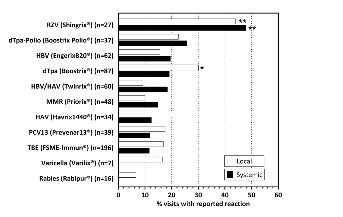 Data expressed as % of visits, with the administration of the respective vaccine that was associated with a local (white) or systemic (black) reaction. Subjects receiving the respective vaccine were compared with the rest of the cohort using Fisher’s exact test. *p <0.05; **p <0.001. RZV: recombinant zoster vaccine (Shingrix®); dTpa(-Polio): diphtheria-tetanus-pertussis (with/without poliomyelitis) vaccine: HBV: hepatitis B vaccine; HAV/HBV: combined hepatitis A and B vaccine; MMR: combined measles-mumps-rubella vaccine; HAV: hepatitis A vaccine; PCV13: pneumococcal conjugate vaccine; TBE: tick-borne encephalitis vaccine.
