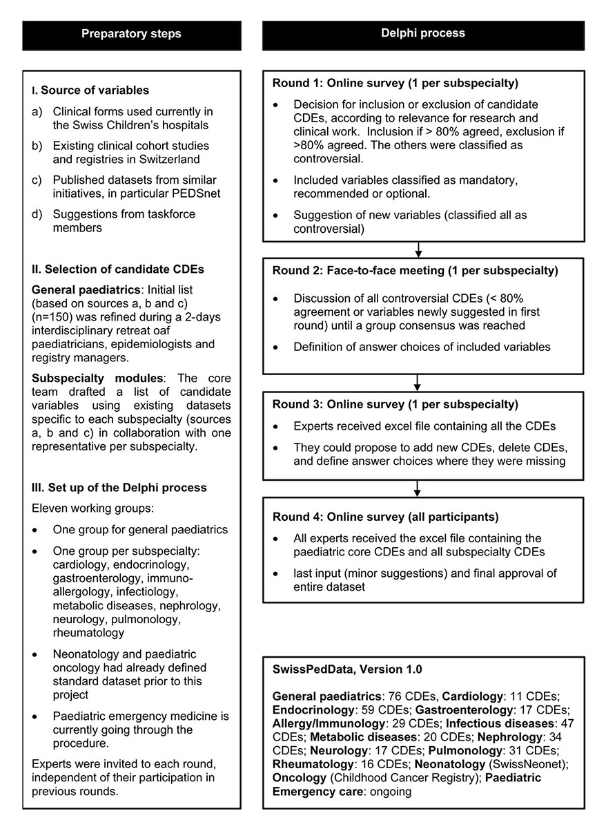 The main strength of SwissPedData is that it is based on broad agreement between paediatricians from all university and cantonal paediatric clinics in Switzerland. The project received strong support from all clinical directors of Swiss children’s hospitals, from the paediatric research network SwissPedNet and from more than 100 experienced paediatricians who participated in its development. SwissPedData emphasises the prospective collection of standardised data, which can greatly reduce the time and costs needed for data preparation and analysis as it avoids the need for retrospective standardisation or double entry. Our consensus finding approach could be adapted for use by other medical specialties that wish to define CDEs in the future.