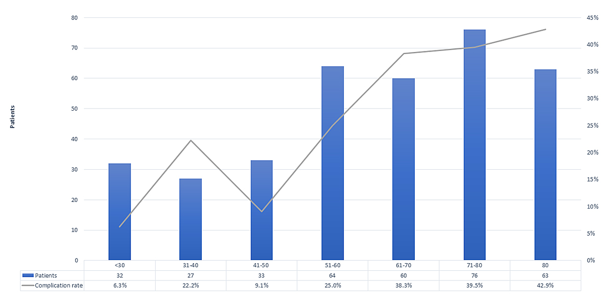 Age was a significant risk factor (OR 1.035, 95% CI 1.02–1.051; p = 0.0005). For each additional year of age, the odds for a complication increased by 3.5% and for 10 years by 41.4%. The complication rates per age group are shown in figure 3, which indicates a marked increase between 50 and 60 years of age. Women and men had comparable complication rates (females 32.3%, 65/201; males 33.1%, 51/154).
