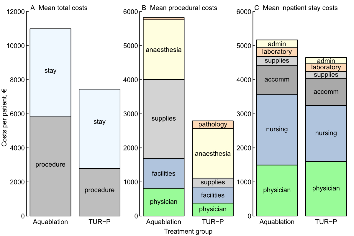 In-hospital costs are significantly higher for aquablation than for TURP, mainly due to higher costs of medical supplies for the procedure. This difference should be taken into consideration, at least in patients for whom the different side effect profiles of both treatments are irrelevant.