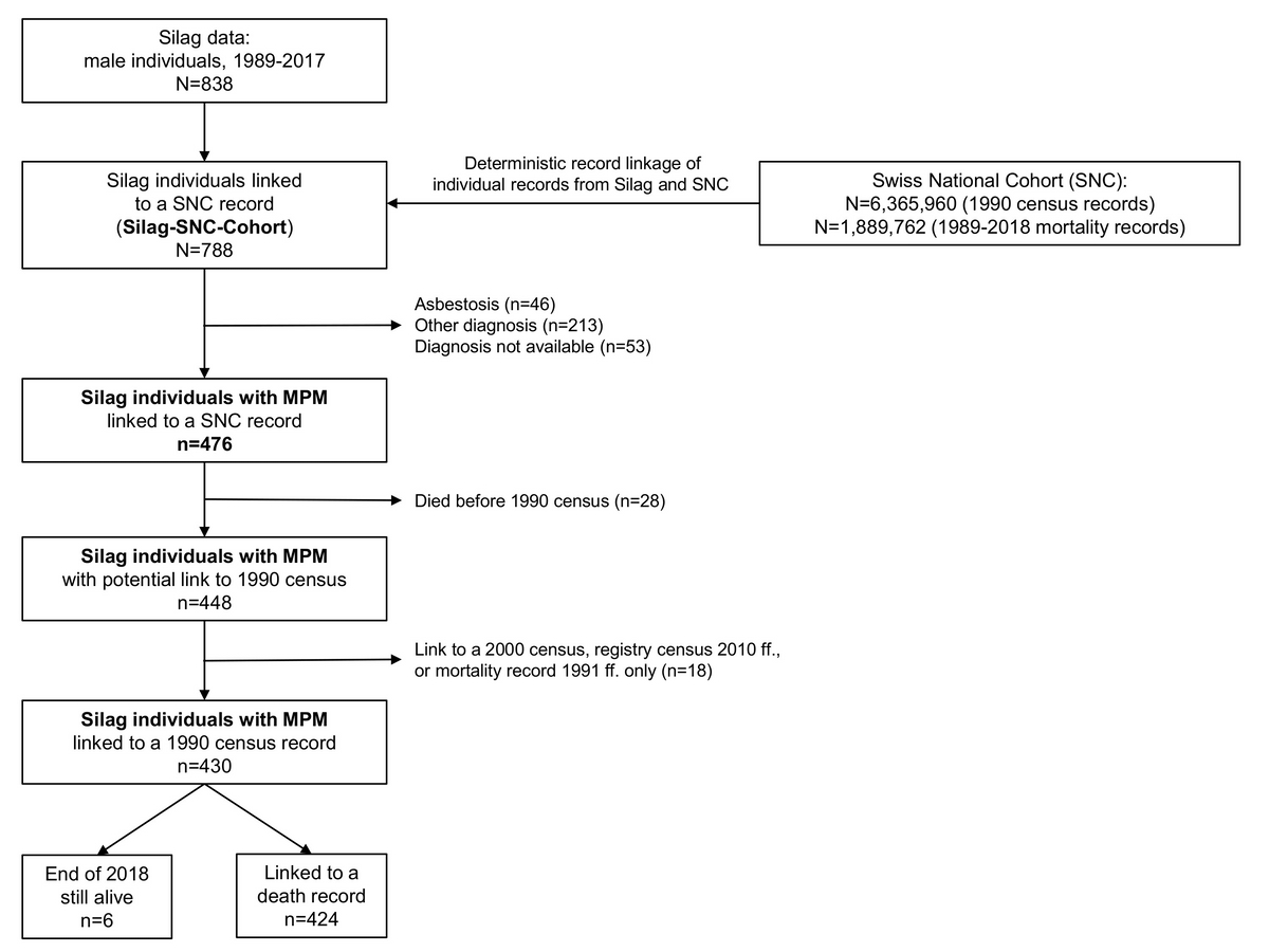 Figure 1 Flow chart of Silag individuals linked to the Swiss National Cohort (SNC) with focus on mesothelioma. MPM: malignant pulmonary mesothelioma