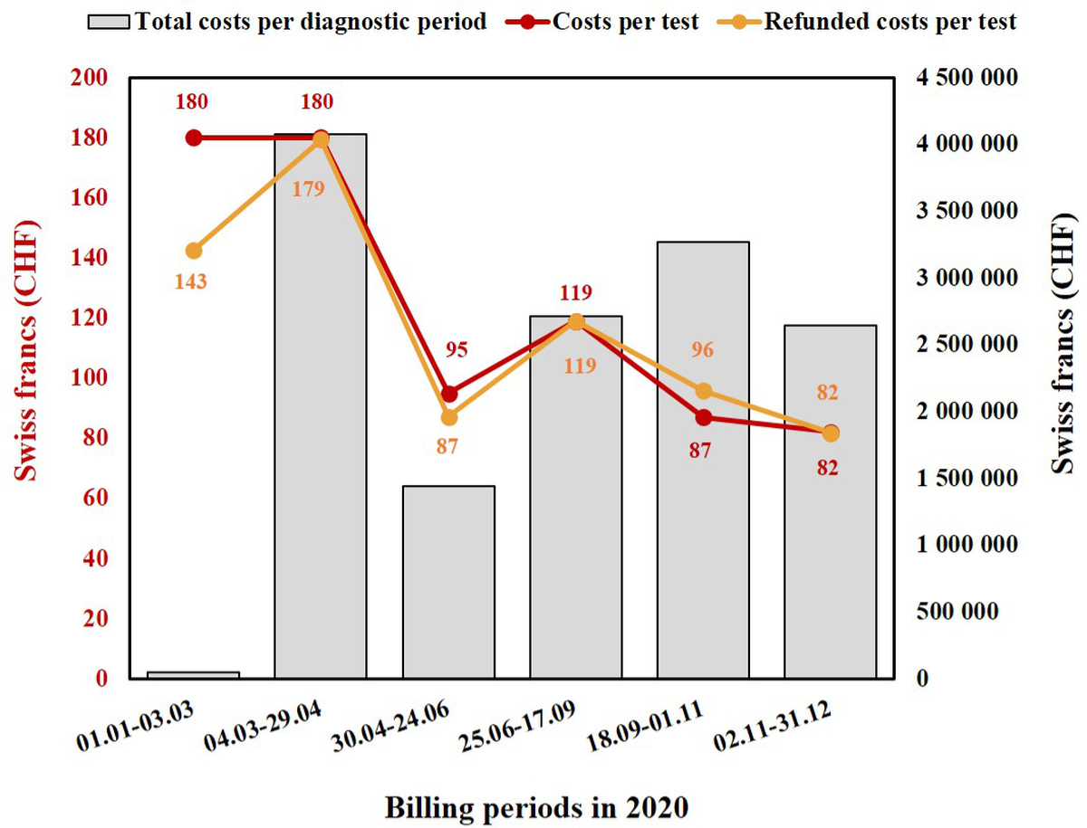 Figure 1 Changes in billing costs per RT-PCR (CHF) and total cumulative costs for all RT-PCRs per billing period throughout 2020 at Lausanne University Hospital (Switzerland).