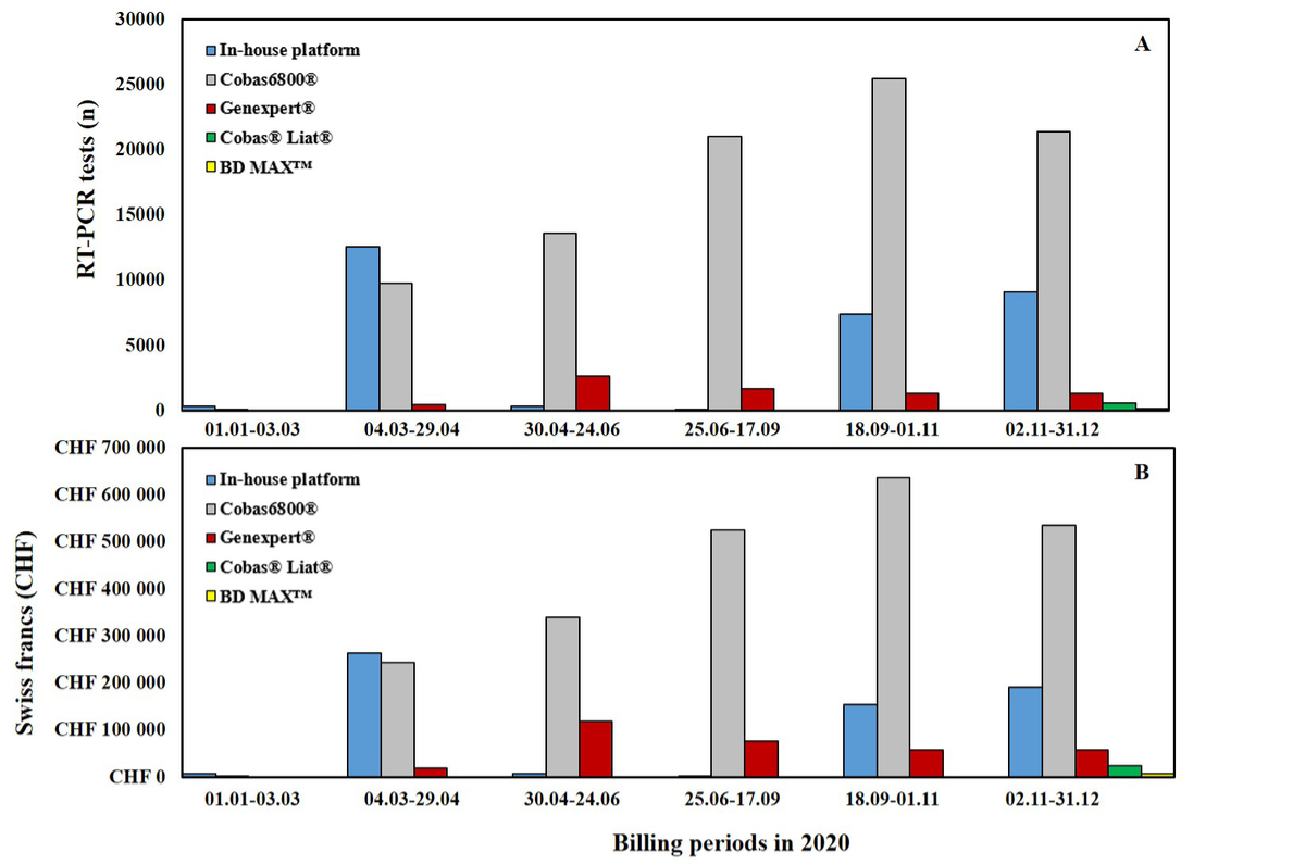 Figure 3 Variations in the number of RT-PCR tests performed and the cumulative costs per molecular platform per billing period throughout 2020 at Lausanne University Hospital (Switzerland).