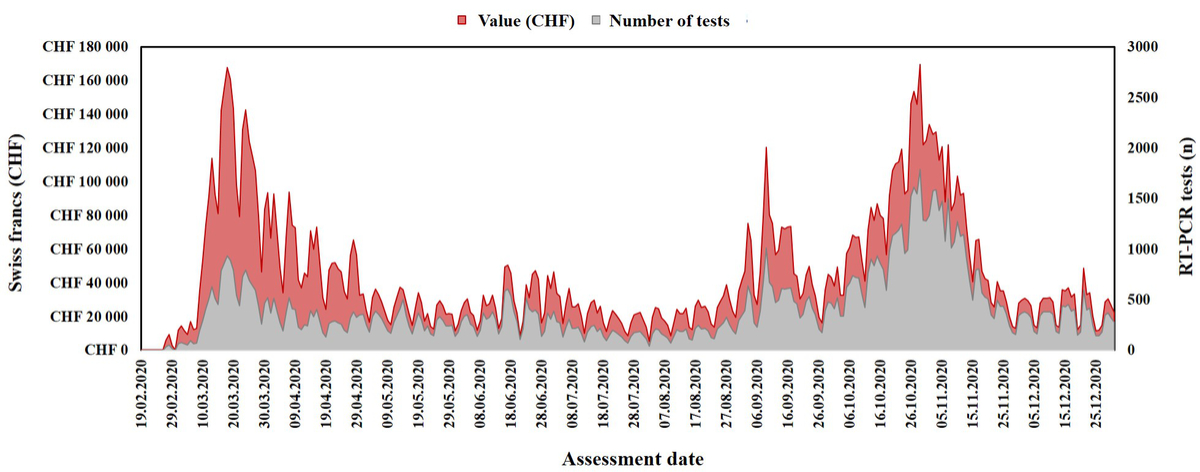 Figure 2 Laboratory reimbursements for SARS-CoV-2 RT-PCR tests compared to the number of tests performed throughout 2020 at Lausanne University Hospital (Switzerland).