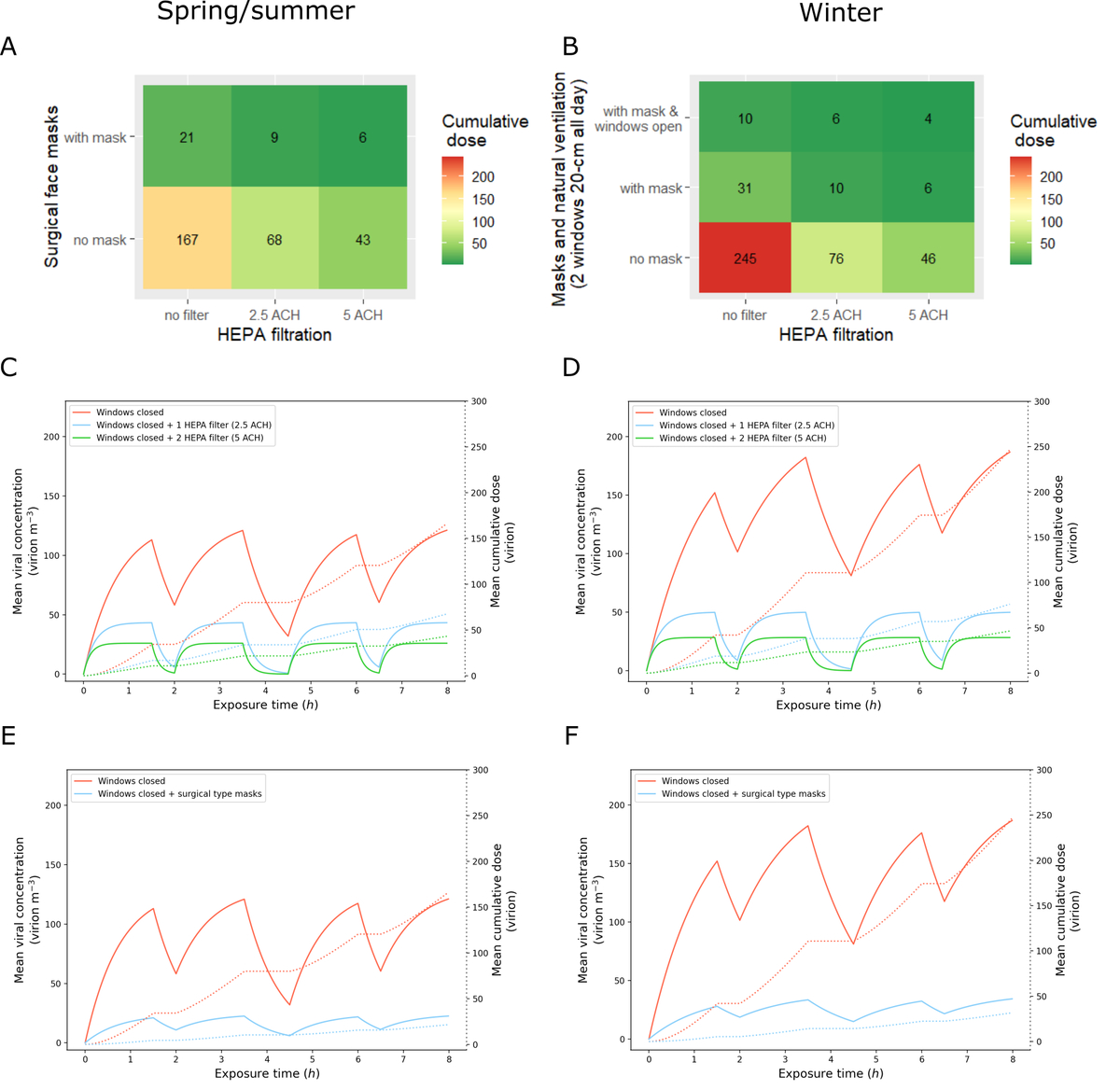 The second intervention simulated was the use of HEPA filtration devices. We tested the recommended 5 air changes per hour (ACH) [28], where two filters per classroom are needed (HEPA device each delivering a CADR up to 400 m3h-1; 800 m3h-1 in total), and an intermediate 2.5 ACH (CADR 400 m3h-1) corresponding to one filter (fig. 2a-d). The 2.5 ACH option (400 m3h-1 CADR) decreased the cumulative dose 2.5-fold in spring/summer (68 virions) and 3-fold in winter (76 virions), making it as effective as two windows 20 cm open all day long during winter (78 virions). The 5 ACH option (800 m3h-1 CADR) was even more effective with a 4-fold decrease in spring/summer and a 5-fold decrease in winter. The universal use of face masks led to an 8-fold decrease in the cumulative dose absorbed in both seasons (fig. 2e-f).