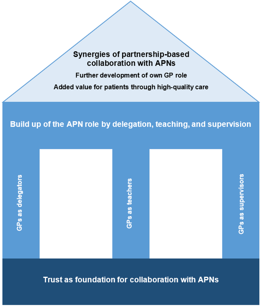 The analysis resulted in three main themes (fig. 1) concerning how GPs experienced the APN integration, particularly regarding changes in their own professional roles. Their experiences were as follows. (1) Trust as foundation for collaboration with APNs; trust is the most critical factor of how that collaboration affects their own roles. Trust allows the GPs (2) the build-up of the APN role by delegation, teaching, and supervision. GPs live their roles as delegators, shaping their own and the APN role by delegating tasks, as teachers by teaching towards delegation, and as supervisors, supporting the APNs in developing professional competencies, without which the new care model could not be built and maintained. Based on the trust built and the APN role developed, (3) GPs experience synergies of a partnership-based collaboration with APNs: APN involvement allows GPs a further development of their own GP role. Collaborating with APNs, GPs find added value for patients through high-quality care.