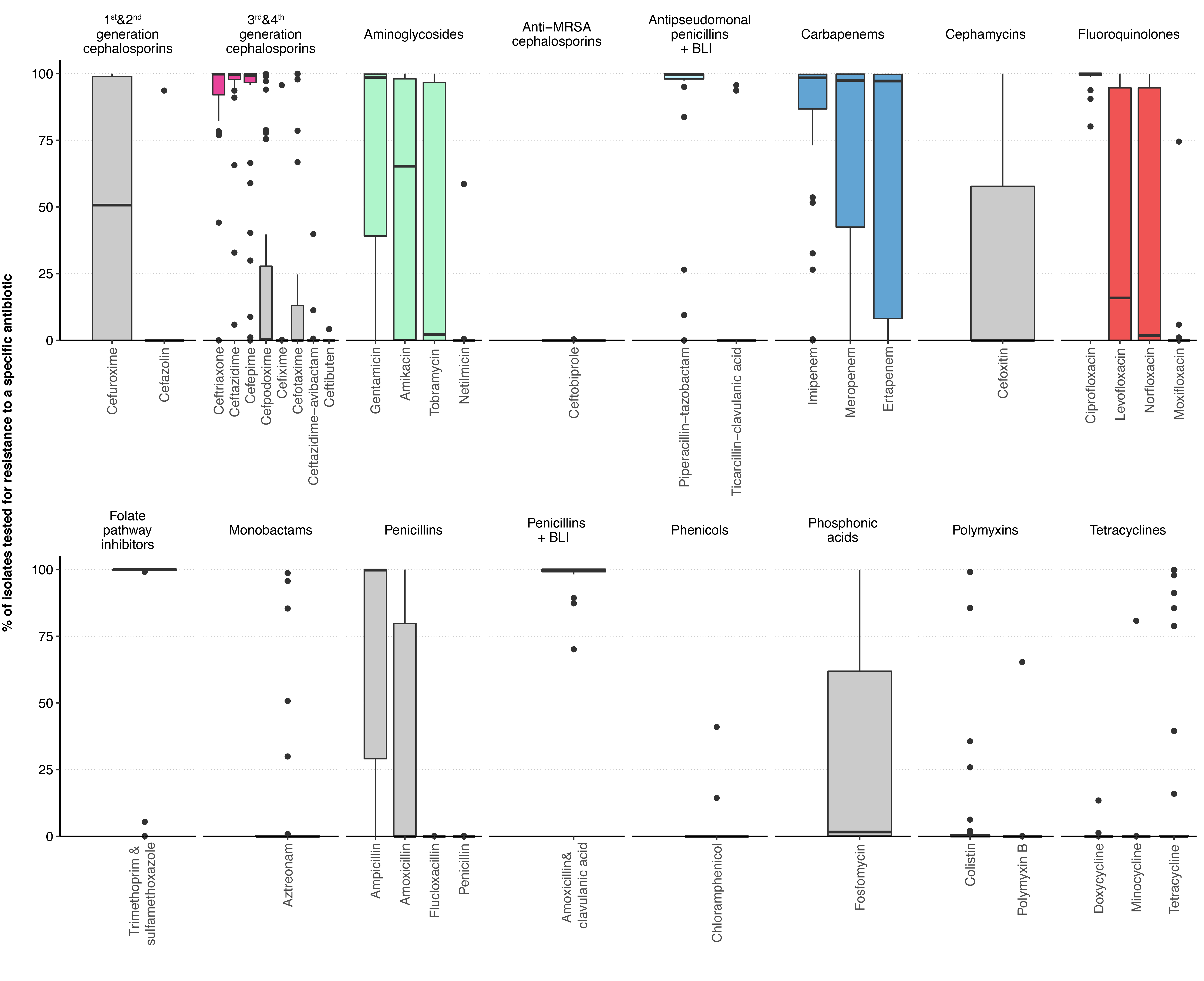 The most frequently tested antibiotics in the five antibiotic categories important for the definition of gram-negative MDR are highlighted in colour. Boxplot with horizontal line for the median of the proportion of isolates tested for an antibiotic per laboratory. Boxes represent the first and third quartile, whiskers extend either to the extreme values of the observations or to 1.5 times the interquartile range, and the dots indicate the laboratories declared as outliers. BLI, β-lactamase inhibitor; ECDC, European Centre for Disease Prevention and Control; MDR, multiple drug resistance; MRSA, methicillin-resistant Staphylococcus aureus.