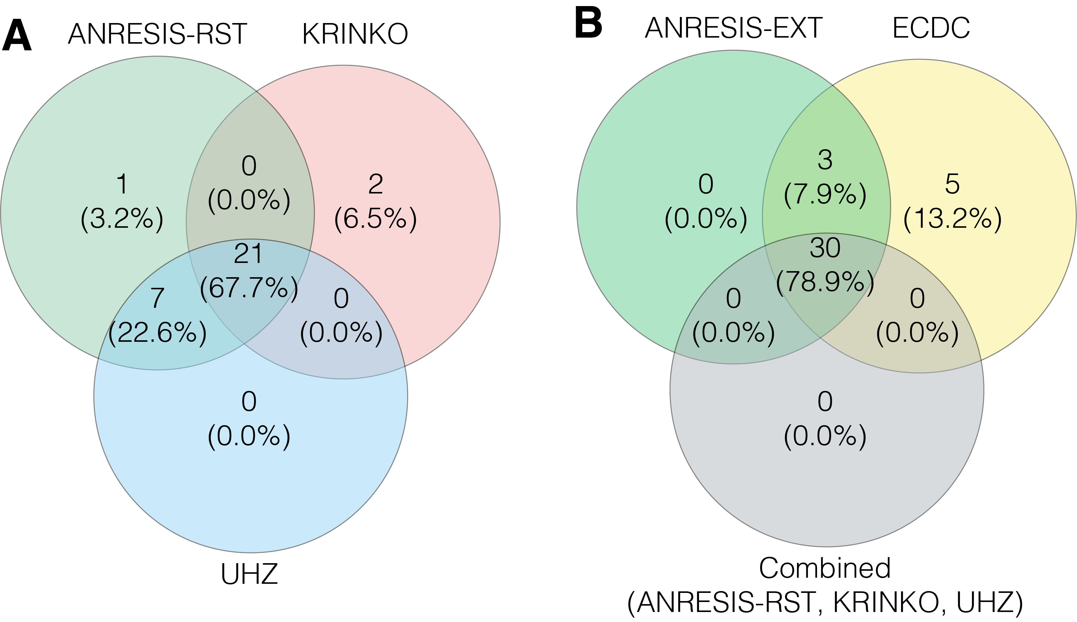 Figure 4 A) Overlap in the number of Enterobacterales isolates classified as MDR following the application of the KRINKO, UHZ and ANRESIS-RST definitions.