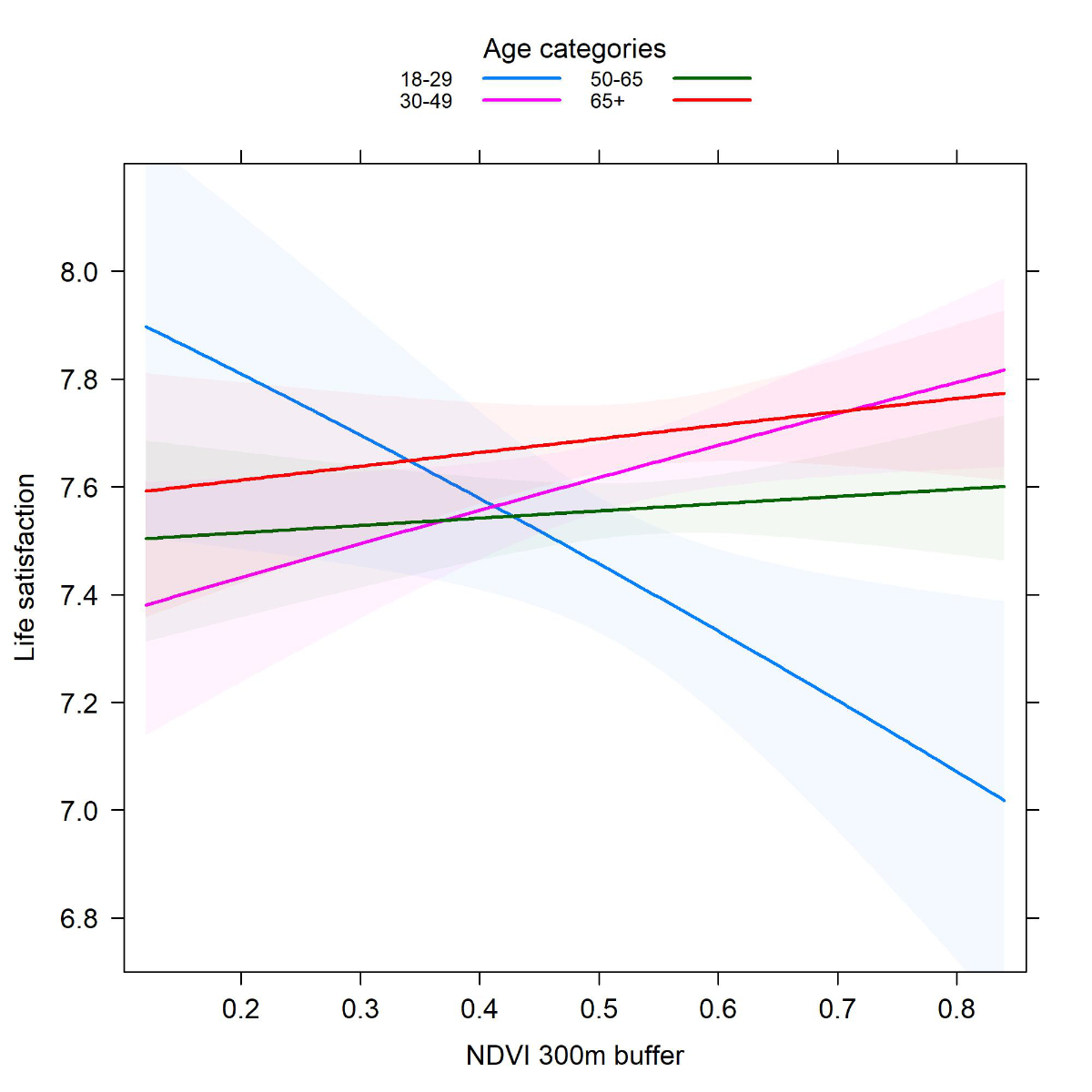 Table 2Moderation by age categories (likelihood ratio test p-value = 0.016). Results from Beta regression of life satisfaction on NDVI by age categories, adjusted for life satisfaction in the past, sex, household income, financial worries, canton, degree of urbanisation, and month of entry.