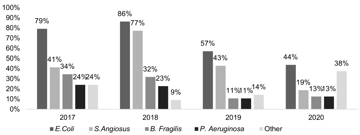 Figure 1 Microorganisms identified in cases of complicated appendicitis (displayed as a percentage per year). This bar chart shows that the most common microorganism found was Escherichia coli peaking at 86% in 2018.