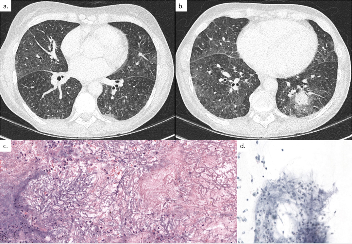 A 63-year-old patient, with a past medical history of large vessel vascultis treated with prednisone, was admitted for the first cycle of induction chemotherapy by idarubicin and cytarabine for myelodysplastic syndrome with excess of blasts type 2 (day 0). The prophylaxis regimen consisted of acyclovir 500 mg three times daily intravenously (IV), co-trimoxazole double-strength (DS) three times weekly orally (PO) and posaconazole 300 mg once daily PO. On day 9 the patient developed persistent neutropenic fever (day 9–15), treated with different broad-spectrum antibiotics, including cefepime, vancomycin, imipenem and levofloxacin. Thoraco-abdominal computed tomography (CT) on day 12 showed diffuse ground-glass opacities with numerous micro-nodules, primarily in the superior and the apical segments of the inferior lobes (fig. 1a). A bronchoscopy was performed on day 13 with a bronchoalveolar lavage (BAL) negative by bacterial and fungal stain, sterile culture, negative viral multiplex polymerase chain reaction (PCR) panel (adenovirus, human metapneumovirus, parainfluenza virus 1–4, rhinovirus, coronaviruses, SARS-CoV-2, influenza A/B, respiratory syncytial virus), Legionella spp. PCR and culture, Pneumocystis jirovecii PCR, Chlamydophila pneumoniae PCR, Mycoplasma pneumoniae PCR, Mycobacterium tuberculosis PCR, and broad-spectrum bacterial and panfungal PCR, and a specific Aspergillus fumigatus and Mucorales spp. PCR. Serum beta-D-glucan (Fungitell) and galactomannan enzyme immunoassay (Platelia Aspergillus Bio-Rad) were negative. Owing to a new episode of neutropenic fever on day 23, another chest CT scan was performed, which showed progression of the diffuse bronchiolitis and a new nodular lesion of 2 cm in the left lower lobe, prompting a second bronchoscopy on day 24 (fig. 1b). The repeat BAL was negative for all previously mentioned diagnostic tests. Because of persistence of neutropenic fever and a new appearing nodular lesion, posaconazole prophylaxis was discontinued and empirical antifungal therapy with liposomal amphotericin B at 5 mg/kg once daily IV was initiated on day 24. Neutropenia resolved by day 29 with rapid clinical improvement and, considering the negative results of both BALs, antifungal treatment was discontinued 10 days later (day 34) without reinitiating antifungal prophylaxis. On the same day, the patient developed a new non-neutropenic fever. A repeat chest CT was performed on day 41, showing the same left lower lobe nodular lesion, unchanged in size. After a seven-day “therapeutic window” with discontinuation of all antifungal treatment, a third bronchoscopy with a transbronchial biopsy was performed on day 42. All BAL stains, cultures and PCR tests (M tuberculosis PCR, Aspergillus spp. PCR, Pneumocystis jirovevii PCR, panfungal PCR, Mucorales spp. PCR) remained sterile and negative, respectively. The transbronchial biopsy was positive for multiple septate branching fungal hyphal forms (fig. 1c). A specific fungal stain (Grocott-Gomori) was positive (fig. 1d).