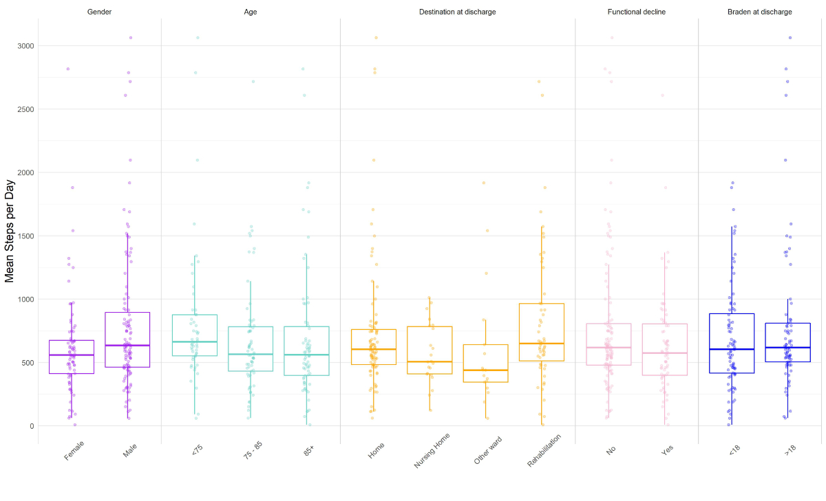 There was a significant difference in the median number of steps depending on the destination at discharge (returning home, home with nursing, nursing home, rehabilitation, or other ward; p = 0.046, table 2).