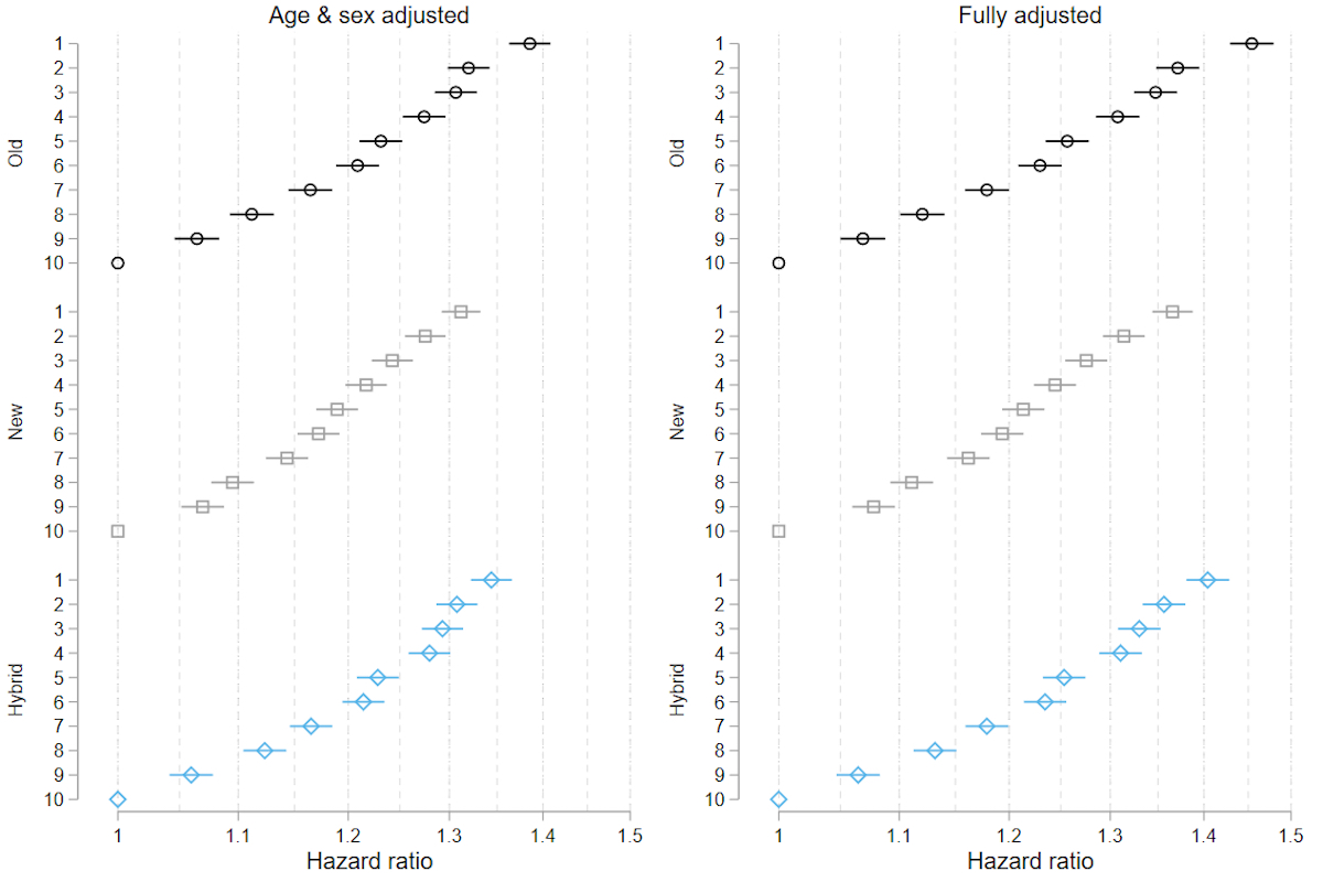 Figure 3 Hazard ratios of all-cause mortality across deciles of the three versions of the Swiss-SEP indices.