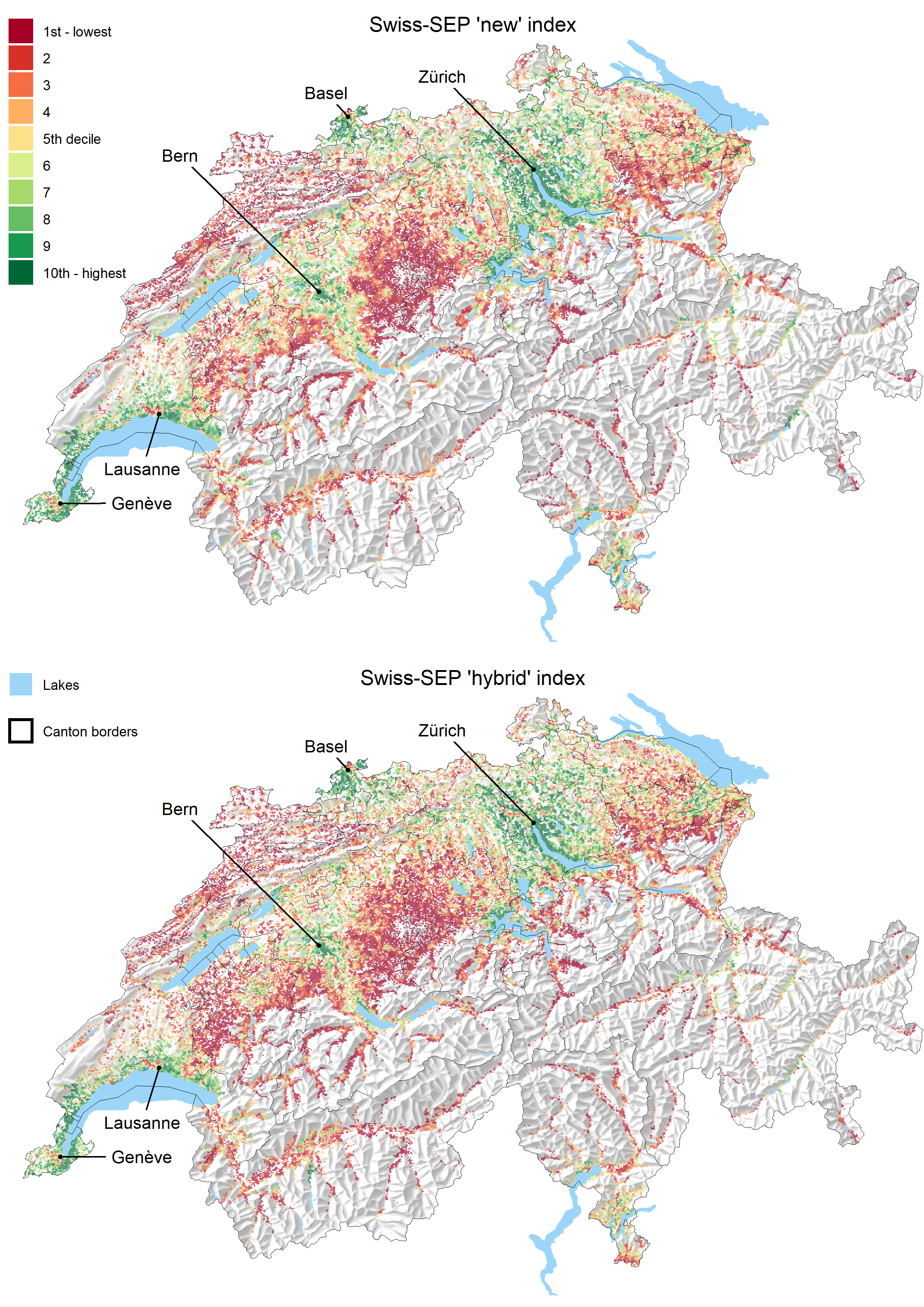 Figure 1 Map of the new (Swiss-SEP 2) and hybrid (Swiss-SEP 3) indices. The original values of 1.54 million neighbourhoods were aggregated into a hexagonal grid with a cell size of 500 m to improve the figure’s clarity. Each grid displays the median value of index deciles.