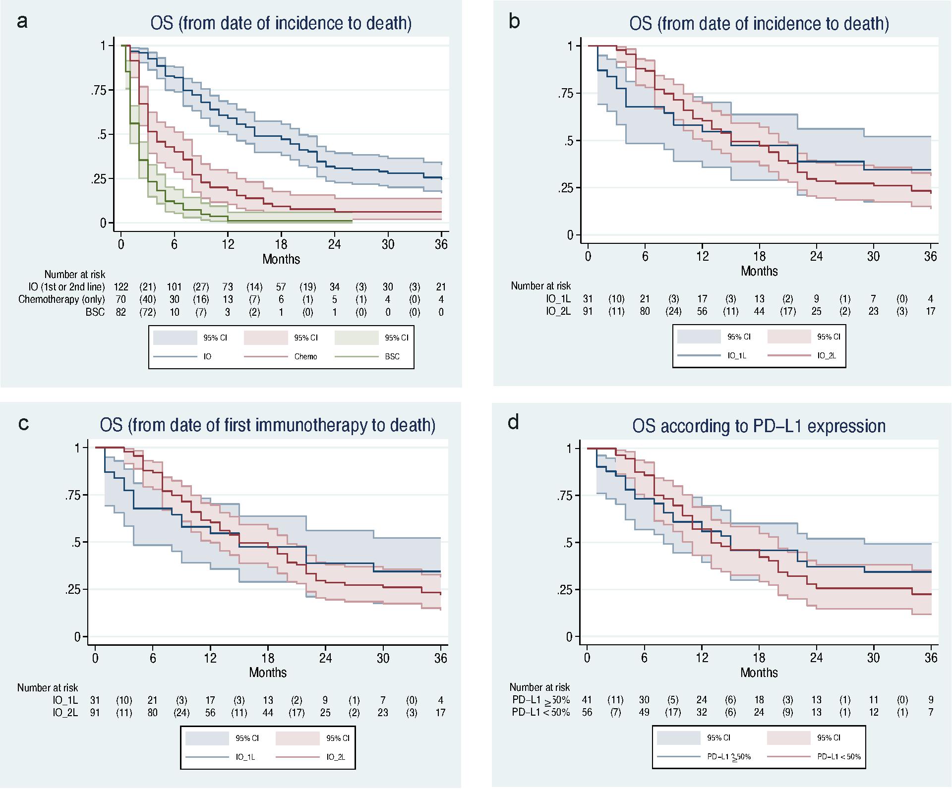 The median overall survival for all patients receiving checkpoint inhibitor therapy (IO group) was 15 months (95% CI 12–20). Patients treated with chemotherapy had a median overall survival of 4 months (95% CI 3–7), and patients with best supportive care had a median overall survival of 2 months (95% CI 1–2) (fig. 2a).For the analysis from the time of diagnosis, the adjusted risk (for the date of incidence and age) of death for patients treated with chemotherapy was approximately 2.7 times higher (adjusted HR [aHR] 2.67, 95% CI 1.92–3.71; p <0.001), and it was approximately 7 times higher (aHR 6.96, 95% CI 4.95–9.79; p <0.001) for patients treated with best supportive care compared with those treated with anti-PD-1/PD-L1 in any line.