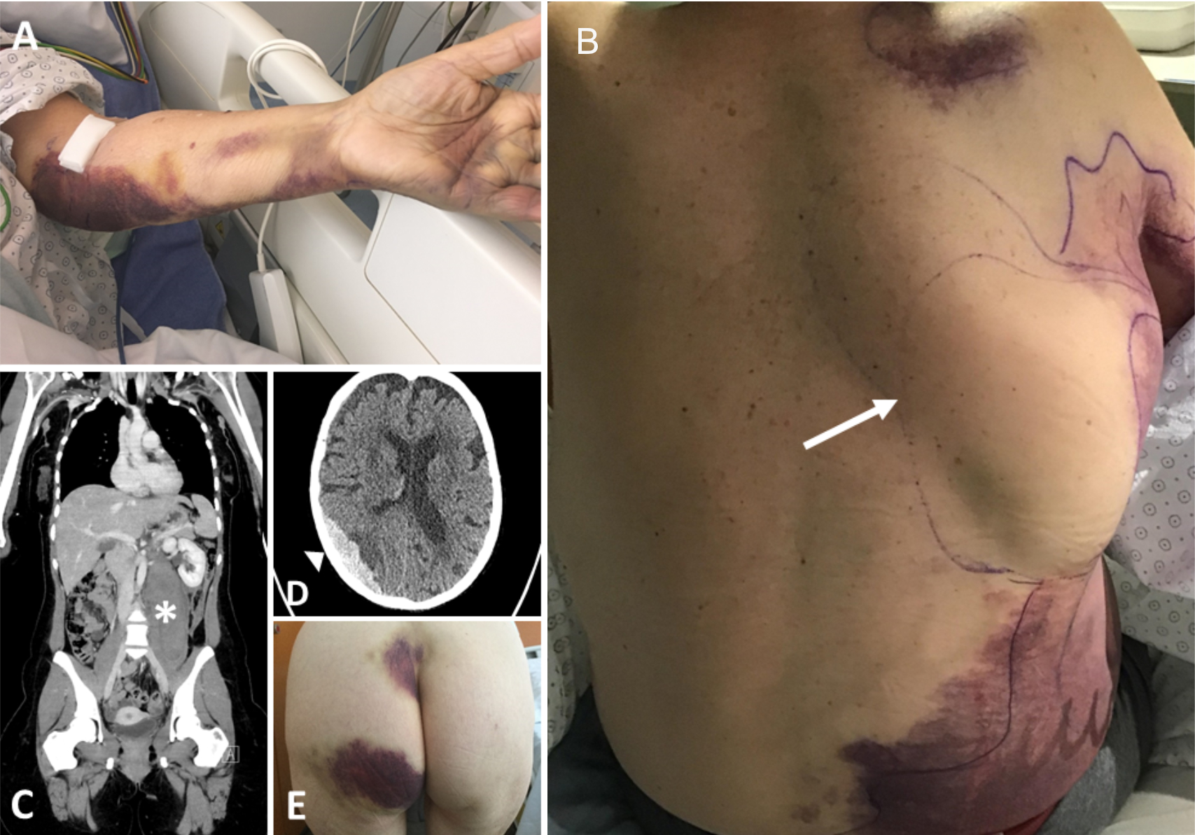 Figure 1 Bleeding pattern in patients with acquired haemophilia A; (A) subcutaneous bleeding after venipuncture (patient 9). (B) large spontaneous bruises and bleeding into the latissimus dorsi muscle (arrow; patient 8). (C) spontaneous retroperitoneal bleeding in the psoas muscle (asterisk; patient 3); (D) subdural haematoma following frequent falls while on direct oral anticoagulant therapy (arrowhead; patient 4); (E) large skin haematomas on the backside under low-dose heparin therapy (patient 5).