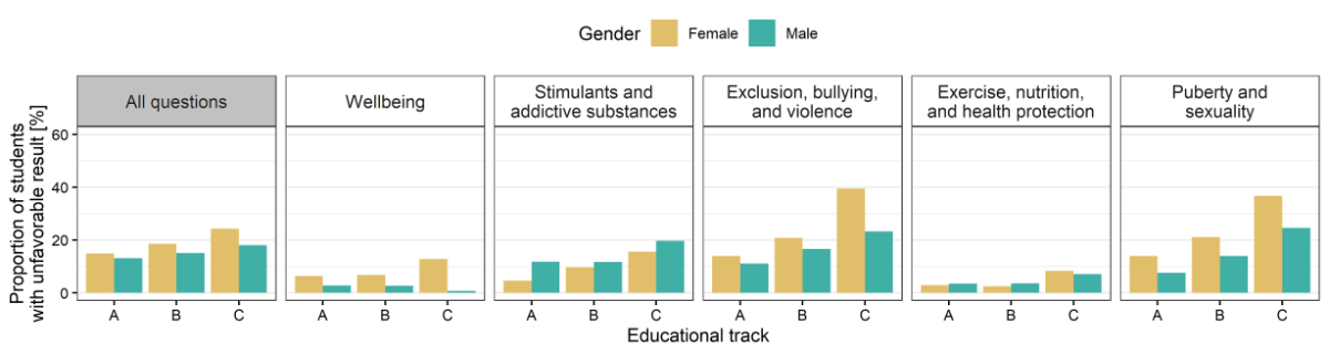 Figure 2Proportion of students with unfavourable scores, for all questions and within the five overarching health topics, by educational track and gender. Educational tracks: A (highest), B (intermediate) and C (lowest). Number of students: n = 1069.