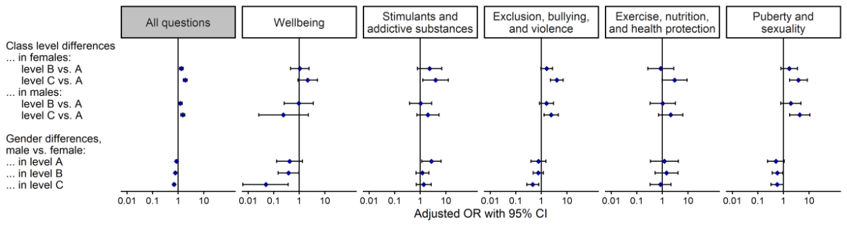 Figure 3Associations of gender and educational track with unfavourable scores, for all questions and within the five overarching health topics. Odds ratios (ORs) with 95% confidence intervals (CIs) are presented on a logarithmic scale. ORs >1 indicate a positive association with unfavourable scores. For “Exclusion, bullying and violence” and “Exercise, nutrition and health protection”, we used simple logistic regression without random effects to ensure well-defined models. Number of students: n = 1069.